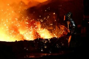 ARCHIV: Ein Stahlarbeiter steht inmitten von Funken aus Roheisen, die aus einem Hochofen in einem Stahlwerk von ThyssenKrupp sprühen, Duisburg, Deutschland, 5. November 2025 . REUTERS/Leon Kuegeler