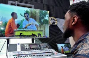 Hannington Muhumuza Wacha, also known as Producer Hannz, a music producer, works inside his studio after a Reuters interview where he says he met with the new Mayor of New York City Zohran Mamdani when they were working on the movie “Queen of Katwe” and where Mamdani was the sound director and wanted sound tracks, in Kampala, Uganda November 6, 2025. REUTERS/Abubaker Lubowa