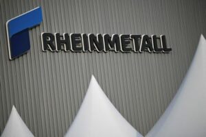 FILE PHOTO: Logo of the ammunition maker Rheinmetall, on the day of the inauguration of a new artillery plant of ammunition maker Rheinmetall, in Unterluess, Germany August 27, 2025. REUTERS/Annegret Hilse/File Photo