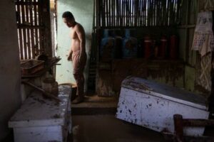 Mark Angelo Lopez takes a break from scooping mud out of their home in the aftermath of flooding brought on by Typhoon Kalmaegi in Consolacion, Cebu, Philippines, November 6, 2025. REUTERS/Eloisa Lopez