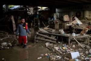 A man wades through muddy water in a community beneath Mananga Bridge following flooding caused by Typhoon Kalmaegi, in Talisay, Cebu, Philippines, November 6, 2025. REUTERS/Eloisa Lopez
