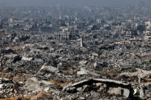 Destroyed buildings as seen from an Israeli military outpost within the borders of the ‘yellow line’ in the Shujaiya neighborhood in the eastern part of Gaza City, in the Gaza Strip, November 5. REUTERS/Nir Elias