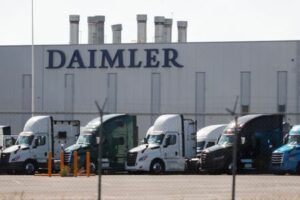 The Daimler logo hangs on a wall at Daimler Freightliner truck assembly plant in Derramadero, Coahuila state, Mexico, September 27, 2025. REUTERS/Antonio Ojeda