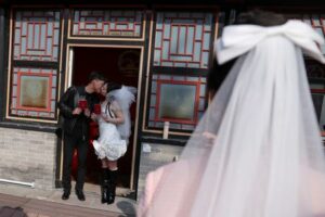 A newlywed couple pose for pictures with their marriage certificates after they registered at the Huguo Guanyin Temple, in Beijing, China, October 28, 2025. REUTERS/Tingshu Wang