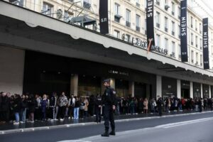 FOTO DE ARCHIVO. La policía francesa asegura la zona mientras la gente hace cola para entrar en los grandes almacenes Le BHV Marais, el Bazar de l’Hôtel de Ville, el día de la apertura del primer espacio físico para el minorista chino de moda rápida online Shein dentro de los grandes almacenes parisinos, en París, Francia. 5 de noviembre de 2025. REUTERS/Abdul Saboor