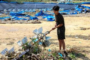 Nguyen Van Sa, 26, a shrimp farmer, cleans debris caused by Typhoon Kalmaegi in Phu My, Gia Lai Province, Vietnam, November 7, 2025. REUTERS/Minh Nguyen