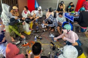 People charge their phones and electronic devices following power outages caused by Typhoon Kalmaegi in Phu My, Gia Lai Province, central Vietnam, November 7, 2025. REUTERS/Thinh Nguyen