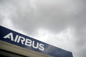The logo of Airbus is pictured at the entrance of the Airbus facility in Bouguenais, near Nantes, France, July 2, 2020. REUTERS/Stephane Mahe