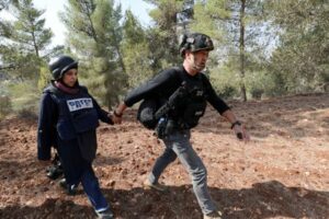 Reuters security adviser Grant Bowden evacuates Reuters photographer Raneen Sawafta following an Israeli settlers attack, near Nablus in the Israeli-occupied West Bank, November 8, 2025. REUTERS/Nidal Eshtayeh