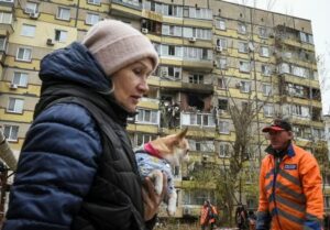 Una mujer con un perro camina cerca de un edificio de apartamentos alcanzado durante un ataque de drones rusos, en medio del ataque de Rusia a Ucrania, en Dnipró, Ucrania, el 8 de noviembre de 2025. REUTERS/Mykola Synelnykov