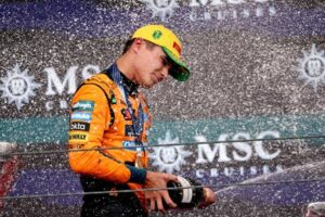 Fórmula Uno F1 – Gran Premio de Sao Paulo – Autódromo José Carlos Pace, Sao Paulo, Brasil – 9 de noviembre de 2025. Lando Norris de McLaren celebra en el podio después de ganar el Gran Premio de Sao Paulo REUTERS/Amanda Perobelli