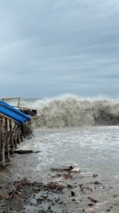 A large wave rises before crashing onto a structure on the coastline, as Typhoon Fung-wong approaches the Philippines, in Dingalan, Aurora, Philippines, November 9, 2025, in this screengrab obtained from a social media video. X/@exevincii/via REUTERS