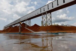 FILE PHOTO: Mounds of bauxite are stored at Shandong Nanshan Aluminium’s integrated aluminium plant in Bintan, Indonesia May 5, 2023. REUTERS/Edgar Su/File Photo
