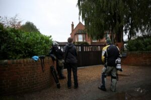 Members of the media wait outside the home of former Director General of BBC Tim Davie, after he and Chief Executive of BBC News Deborah Turness resigned following accusations of bias at the British broadcaster, including in the way it edited a speech by U.S. President Donald Trump, in Henley-on-Thames, Britain, November 10, 2025. REUTERS/Isabel Infantes