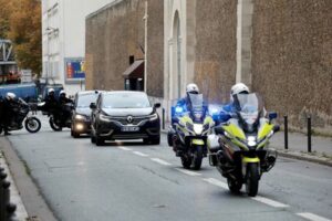 Vehicles believed to be carrying former French President Nicolas Sarkozy leave the Sante prison, after a Paris court granted him an early release from jail, pending an appeal, weeks after he started a five-year sentence for conspiring to raise campaign funds from Libya, in Paris, France, November 10, 2025. REUTERS/Benoit Tessier