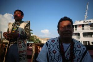 People look on aboard a boat after a flotilla carrying Indigenous representatives from across Latin America arrived in Belem, ahead of the UN Climate Change Conference (COP30), in Brazil, November 9, 2025. REUTERS/Adriano Machado