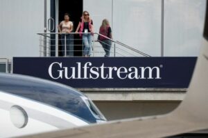 People stand near a Gulfstream Aerospace logo at the 54th International Paris Airshow at Le Bourget Airport near Paris, France, June 18, 2023. REUTERS/Benoit Tessier