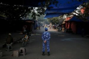 Un miembro del personal de seguridad vigila una zona de mercado cerrada cerca del lugar de la explosión, junto al histórico Fuerte Rojo en el casco antiguo de Delhi, India, el 12 de noviembre de 2025. REUTERS/Adnan Abidi