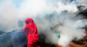 FILE PHOTO: A woman covers her face as a health worker fumigates a residential area where cases of malaria have been reported in Mumbai March 20, 2009. REUTERS/Arko Datta/File Photo