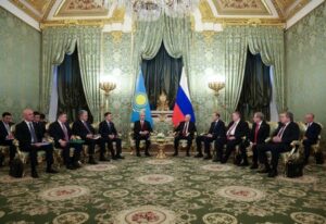 Members of the delegations, led by Russian President Vladimir Putin and Kazakh President Kassym-Jomart Tokayev, attend a meeting at the Kremlin in Moscow, Russia, November 12, 2025. Sputnik/Vyacheslav Prokofyev/Pool via REUTERS