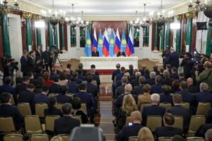 Russian President Vladimir Putin and Kazakh President Kassym-Jomart Tokayev make statements following their talks at the Kremlin in Moscow, Russia, November 12, 2025. Sputnik/Vyacheslav Prokofyev/Pool via REUTERS