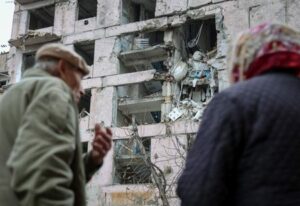 Residents stand near an apartment building hit during the Russian military strike, amid Russia’s attack on Ukraine, in the frontline town of Huliaipole in Zaporizhzhia region, Ukraine November 11, 2025. REUTERS/Sergiy Chalyi