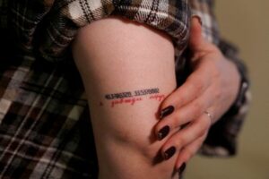 Elona Leleko, 31-years-old, shows a tattoo with the inscription ‘I’m