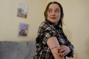 Elona Leleko, 31-years-old, shows a tattoo with the inscription ‘I’m