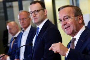 German Defence Minister Boris Pistorius addresses the media with CDU/CSU parliamentary group leader Jens Spahn and Social Democratic Party’s (SPD) parliamentary group leader Matthias Miersch at the lower house of parliament, the Bundestag, in Berlin, Germany, November 13, 2025. REUTERS/Lisi Niesner