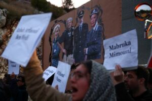A poster depicting European Commission President Ursula von der Leyen, U.S. President Donald Trump, Albania’s Prime Minister Edi Rama and Italy’s Prime Minister Giorgia Meloni is seen as activists from Italy, Albania, and other European countries protest against Italy-Albania detention camps in Gjader, Albania, November 1, 2025. REUTERS/Florion Goga