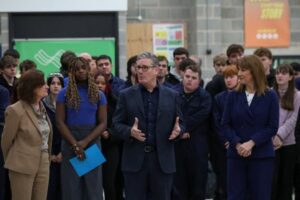 Britain’s Prime Minister Keir Starmer speaks next to Britain’s Chancellor of the Exchequer, Rachel Reeves, and First Minister of Wales Eluned Morgan, at the engineering workshop at Coleg Menai, during Starmer’s visit to announce Wylfa on Anglesey, an island in North Wales, as the location for the country’s first small modular reactor, in Llangefni, Britain, November 13, 2025. REUTERS/Temilade Adelaja/Pool