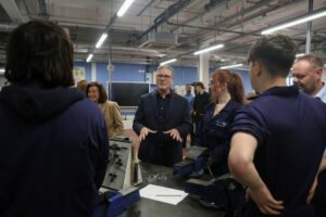 Britain’s Prime Minister Keir Starmer speaks to students at the engineering workshop at Coleg Menai during his visit to announce Wylfa on Anglesey, an island in North Wales, as the location for the country’s first small modular reactor in Llangefni, Britain, November 13, 2025. REUTERS/Temilade Adelaja/Pool