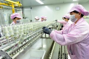Workers work on a production line manufacturing bottle caps for export at a factory of a packaging company in Donghai county of Lianyungang, Jiangsu province, China April 10, 2025. China Daily via REUTERS