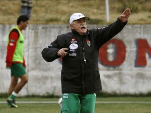 l entrenador principal del Olivia, Xavier Azkargorta, da instrucciones a sus jugadores durante una sesión de entrenamiento en La Paz
