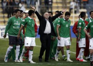 El seleccionador de Bolivia, Xavier Azkargorta (C), saluda a los aficionados junto a sus jugadores tras el partido de clasificación para el Mundial de 2014 contra Uruguay en La Paz