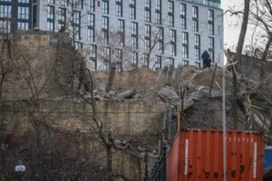 People walk near the Heydar Aliyev park, which was damaged during an overnight Russian drone and missile strike, amid Russia’s attack on Ukraine, in Kyiv, Ukraine, November 14, 2025. REUTERS/Alina Smutko