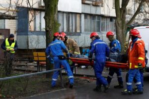 Rescuers carry the body of a victim found under debris at the site of an apartment building hit during an overnight Russian drone and missile strike, amid Russia’s attack on Ukraine, in Kyiv, Ukraine, November 14, 2025. REUTERS/Valentyn Ogirenko