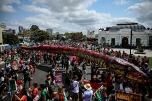 Demonstrators carry a representation of a snake during a protest to call for climate justice and territorial protection during the U.N. Climate Change Conference (COP30), in Belem, Brazil, November 15, 2025. REUTERS/Adriano Machado