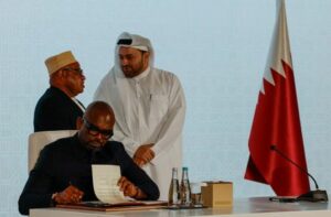 Congo’s President Felix Tshisekedi’s high representative Sumbu Sita Mambu signs a framework agreement for a peace deal aimed at ending fighting in eastern Congo, at a ceremony with the head of the M23 rebel group delegation Benjamin Mbonimpa (not pictured), in Doha, Qatar, November 15, 2025. REUTERS/Ibraheem Abu Mustafa