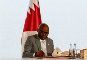 Head of the M23 rebel group delegation Benjamin Mbonimpa signs a framework agreement for a peace deal aimed at ending fighting in eastern Congo, at a ceremony with Congo’s President Felix Tshisekedi’s high representative Sumbu Sita Mambu (not pictured), in Doha, Qatar, November 15, 2025. REUTERS/Ibraheem Abu Mustafa