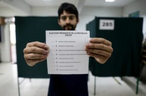 Un hombre sostiene una papeleta en un colegio electoral, el día de las elecciones presidenciales, en Santiago, Chile 16 de noviembre 2025. REUTERS/Juan González