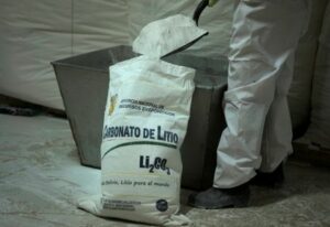 FOTO DE ARCHIVO-Un trabajador manipula carbonato de litio en la planta piloto de litio de Llipi en el departamento de PotosĂ, Bolivia. 29 de noviembre de 2017. REUTERS/David Mercado
