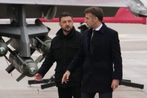 French President Emmanuel Macron and Ukrainian President Volodymyr Zelenskiy arrive to sign a letter of intent to buy up to 100 Rafale warplanes from France, at the Villacoublay air base near Paris, November 17, 2025. Christophe Ena/Pool via REUTERS