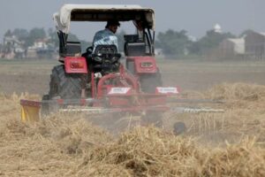 A farmer uses a rake machine as an alternative to stubble burning, to gather paddy straw into neat rows, amid ongoing air pollution, in Balwar Kalan village in the northern state of Punjab, India, November 13, 2025. REUTERS/Bhawika Chhabra