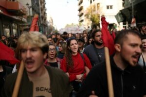Estudiantes corean eslóganes durante una marcha para conmemorar el 52º aniversario del levantamiento estudiantil de 1973 contra la junta militar que gobernaba el país en aquel momento, en Atenas, Grecia. 17 de noviembre de 2025. REUTERS/Stelios Misinas