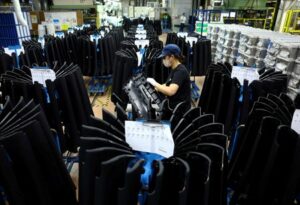FILE PHOTO: An employee works on the assembly line at Nanjo Auto Interior, a manufacturer of inside door panels and other parts for Mazda Motor, in Akitakata, Hiroshima Prefecture, Japan July 14, 2025. REUTERS/Issei Kato/File Photo