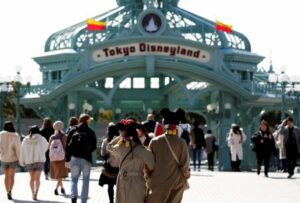 FILE PHOTO: Visitors are seen outside Tokyo Disneyland in Urayasu, east of Tokyo, Japan February 28, 2020. REUTERS/Issei Kato/File Photo