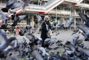 Parisian psychologist Catherine Hervais walks amid flying pigeons on her daily mission to care for the capital’s pigeons in front of the Centre Pompidou (aka Beaubourg) in Paris, France, November 4, 2025. REUTERS/Lucien Libert