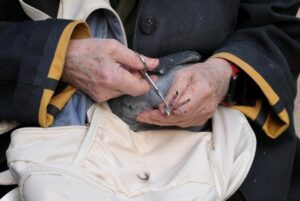 Parisian psychologist Catherine Hervais cuts strings entangled around a pigeon’s foot on her daily mission to care for the capital’s pigeons in front of the Centre Pompidou (aka Beaubourg) in Paris, France, November 4, 2025. REUTERS/Lucien Libert