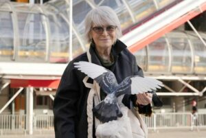 Parisian psychologist Catherine Hervais poses with a pigeon on her daily mission to care for the capital’s pigeons in front of the Centre Pompidou (aka Beaubourg) in Paris, France, November 4, 2025. REUTERS/Lucien Libert